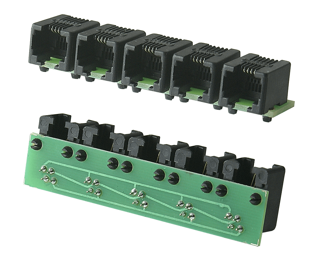 Spliter boarfd for 1wire signal. Necessary if you like to connect more sensors (like DS18B20) to one RJ11 socket on Lan Controller. On board are 5RJ socets, 4 socket for sensors, one to controller (by 4 wire telephone cord).
