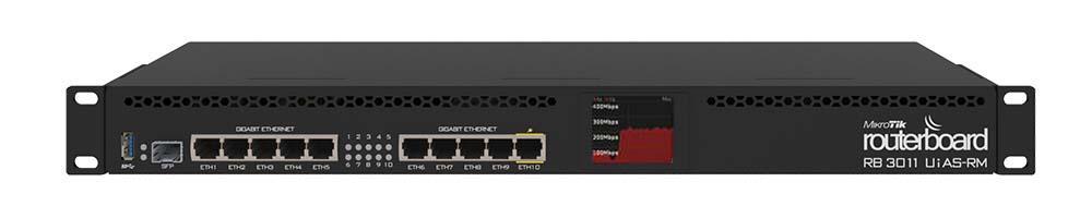 MikroTiK RouterBOARD RB3011UiAS-RM, 1.4 GHz çift çekirdek işlemci, 1GB RAM, 1 Adet SFP slotu, 10 adet Gigabit ethernet portu, 1U standartlarına uygun kasası ile 200+ aktif kullanıcısı bulunan ağ yapıları için hepsi bir arada çözüm sunmaktadır. Ürün LAYER 3 Switch özelliklerinin tamamını sunmakla birlikte Standart RouterOS işletim sisteminin tüm özellikleri ile birlikte gelmektedir. Orta ölçekli ağların tüm ihtiyaçlarını karşılayacak benzersiz teknik donanımı ve RouterOS işletim sistemi ile ağ yönetiminizi hiç olmadığı kadar esnek hale getirebilirsiniz.