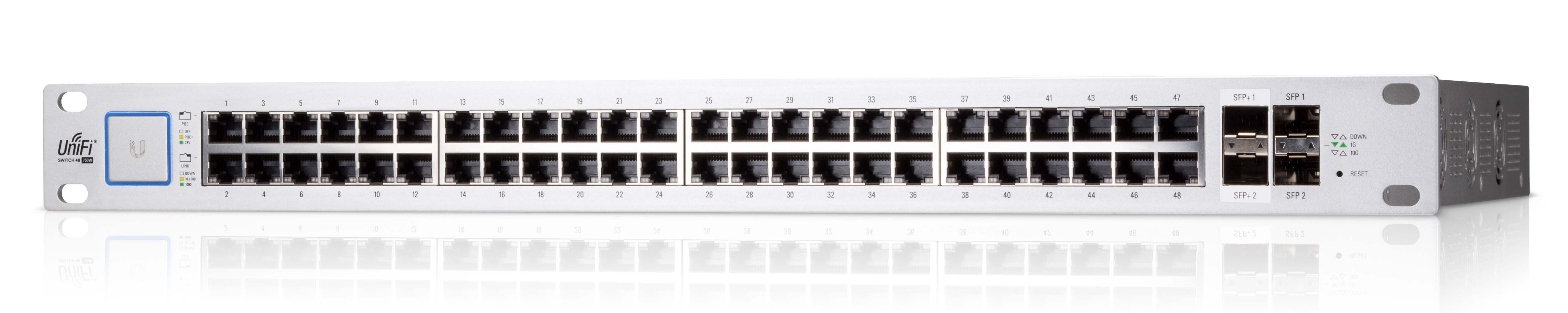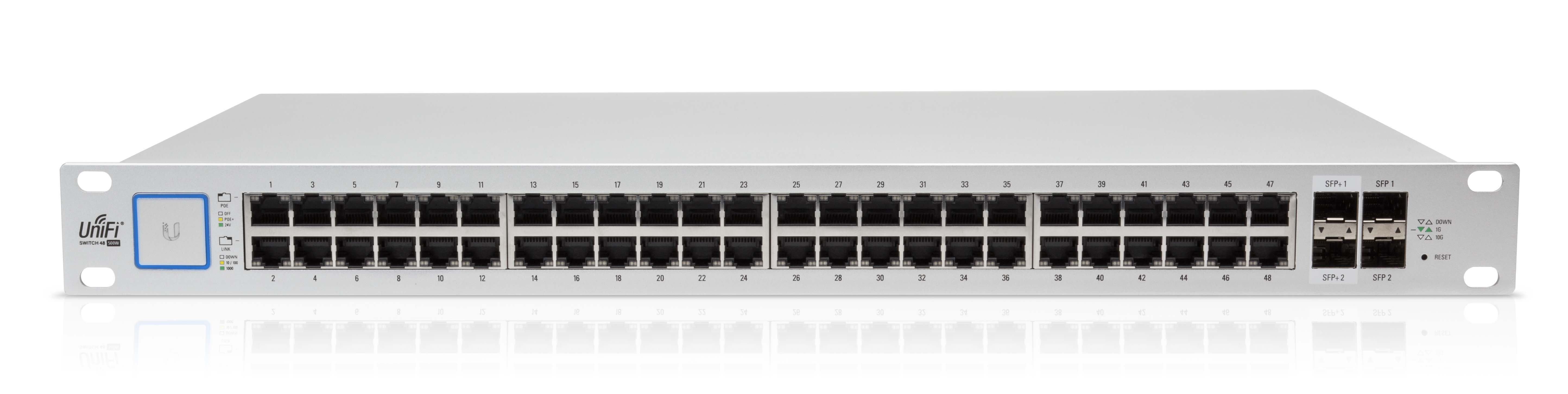 UBNT UniFi ürün ailesinin bir parçası olarak tasarlanmış UBNT UniFi Switch'ler, kurumsal yönetilebilir switch teknolojilierini sezgisel kullanım anlayışı ön planda tutlarak geliştirilen UBNT UniFi Controler yazılımı ile birleştirerek, çoklu cihaz yönetimi ve takibini tüm detayları ile tek bir ortak noktadan kontrol etme imkanı sağlamaktadır. UBNT UniFi Switchürün grubunun, geniş çaplı kurumsal ağ ihtiyaçlarını karşılamak için tasarlanmış UBNT UniFi Switch US-48-500 modeli, Layer -2 ve Layer -3 standartlarını destekleyen gerçek yönetilebilir switch özelliklerinin yanısıra 802,3 af/at ve 24V Pasif PoE standartlarında 48 adet Gigabit ethernet portu, ve 2 adet SFP, 2 adet SFP+ portu ile gelmektedir.